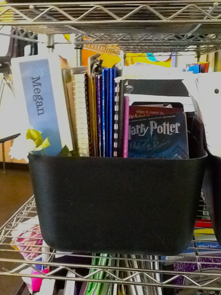 In my classroom, I have tables instead of desks. While it is great for groups and a flexible classroom layout, I miss the storage in the sides of desks. I wanted something flexible as well as practical. I also wanted the inevitable mess to be hidden a bit. I came up with standard baker’s racks that you can get a Costco/Target/Walmart and washing bins you can get at Ikea.